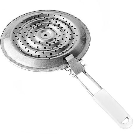 Рассекатель пламени для газовой плиты – приспособление, которое адаптирует конфорку под разные емкости, защищает посуду от соприкосновения с открытым огнем и равномерно распределяет пламя во время приготовления пищи. Адаптер состоит из двух пластин, в обеих предусмотрены отверстия для распределения пламени. Эта подставка на плиту будет незаменима, если необходимо адаптировать конфорку под емкость с меньшим диаметром дна, при этом получается устойчивая поверхность, на которой ничего не перевернется и ручка посуды не будет нагреваться. Прекрасно подойдет при приготовления молочных блюд, каши, варенья, овощной икры, чтобы они не пригорали.