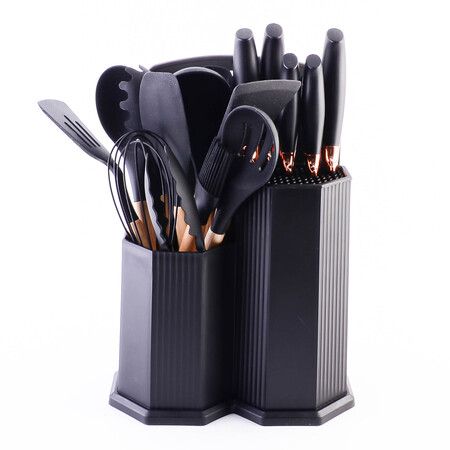 Этот набор кухонных принадлежностей от Posudaplanet.ru включает в себя все, что нужно для приготовления самых разнообразных блюд. Удобная подставка обеспечивает организованное хранение, экономя место на кухне. Черный цвет придает набору современный вид, который гармонично впишется в любой интерьер. Более того, он станет прекрасным и функциональным подарком для близких и знакомых, которые только начинают свой кулинарный путь или уже имеют опыт в приготовлении изысканных блюд.