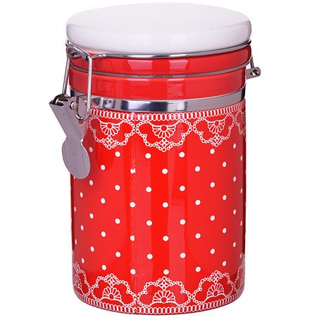 Эта банка станет не только функциональным предметом для хранения продуктов, но и стильным элементом интерьера. Красный цвет с белым узором придают ей особый шарм и привлекательность. Белый горох и кружево на банке создают неповторимый дизайн, который будет радовать глаза и добавлять уют в вашу кухню.