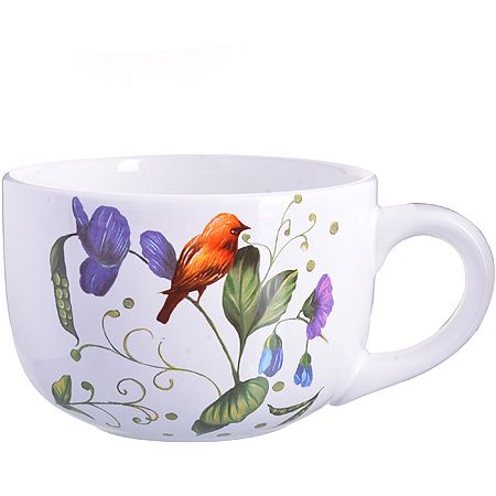 Кружка-супница с ручкой LORAINE просто незаменимый помощник на кухне любой современной хозяйки, он обладает множеством достоинств. Эстетичная круглая глубокая кружка изготовлена из БИО и ЭКО доломитовой керамики высокого качества и украшена красивым цветочным рисунком с птичкой. Керамика один из лучших материалов для использования в быту, долго сохраняет тепло, долговечна и отлично впишется в любой интерьер кухни. Большая кружка предназначена для подачи супа, бульона, каши, окрошки, соуса, крема или салата. Может использоваться в качестве чашки для чая, кофе, компота и других напитков. Бульонница из керамики идеальный вариант для подачи порционного холодца или заливного к новогоднему столу, на пикнике, на даче или просто для посиделок в кругу семьи, с родными и друзьями. Оригинальный дизайн и качество исполнения сделают бульонницу настоящим украшением стола и подчеркнет прекрасный вкус хозяйки, а также станет отличным подарком. Изделие упаковано в индивидуальную коробку. Кружка для супа подходит для использования в микроволновой печи, холодильнике и посудомоечной машине.Кружка-супница 550мл Птичка доломит LR (х36)._x000D_