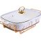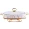 Мармит LORAINE выполнен из фарфора белого цвета, украшенной золотым рисунком. Фарфоровая чаша с удобными ручками располагается на металлической подставке с двумя подсвечниками для чайных свечей (свечи в комплект не входят). Свечи, устанавливающиеся на подставке, нагревают чашу снизу, таким образом поддерживая нужную температуру приготовленного блюда. Стеклянная крышка с удобной ручкой плотно прикрывает чашу сверху, в свою очередь также не давая остыть блюду. Благодаря своему элегантному дизайну, мармит с приготовленным блюдом можно сразу подавать на стол, не перекладывая еду на сервировочные тарелки. Изящный, с современным дизайном, мармит украсит любой праздничный стол, а блюда в нем будут всегда теплыми и ароматными. Фарфоровая чаша (без подставки) подходит для использования в духовом шкафу. Не подходит для мытья в посудомоечной машине. Подходит для хранения в холодильнике.
