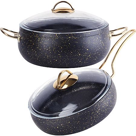 Набор посуды 2 предмета 3+4л черный с золотистыми ручками Mayer&Boch - это красивая и прочная литая алюминиевая посуда с антипригарным покрытием. В набор входят кастрюля с крышкой вместимостью 3 л и сотейник с крышкой вместимостью 4 л. Этот набор идеально подходит для приготовления разнообразных блюд - от супов и соусов до каши и пасты, плова, казан-кебаб и жаркого.