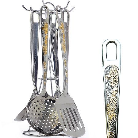 Профессиональный кухонный набор MAYER&BOCH – это практичная и красивая посуда для приготовления, которая воплотит в жизнь любые ваши кулинарные фантазии. В набор входит 7 предметов: половник, ложка, вилка, лопатка с прорезями, пресс для картофеля, шумовка, подставка. Кухонный инвентарь выполнен из высококачественной нержавеющей стали, которая идеально подходит для приготовления пищи. Изделия имеют удобные ручки с отверстиями для подвешивания. Он комплектуется стальной подставкой в форме стакана, которая прекрасно впишется в любой интерьер. Кухонные принадлежности MAYER&BOCH - поможет вам определиться с подарком на Новый год, Рождество, День Рождения, это универсальный и полезный подарок маме, бабушке, друзьям.