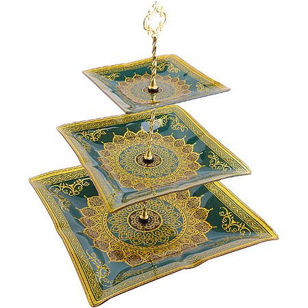 Эта этажерка предназначена для красивой подачи конфет, фруктов и десертов. Благодаря трех ярусам, вы сможете удобно разместить разнообразные угощения и создать красивый композицию на вашем столе. Прочная стойка и плоская ножка обеспечивают устойчивость этажерки, а яркое красочное покрытие и блестящий узор делают ее стильным элементом декора.