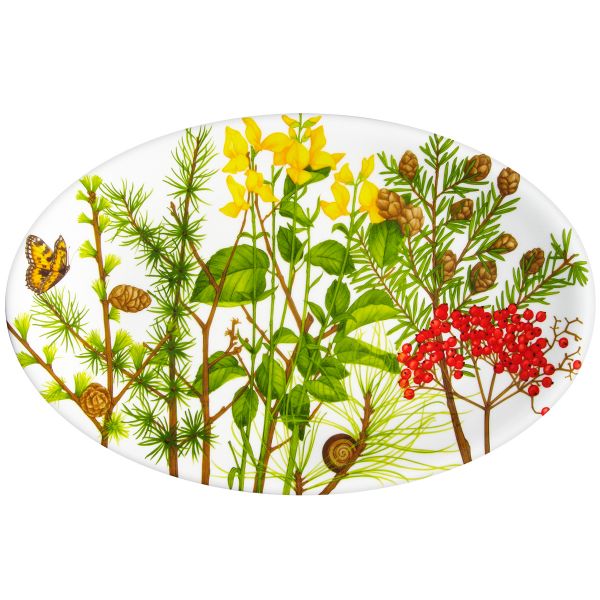 Каждая деталь декора вырисовывается вручную. Блюдо сервировочное овальное, размером 40,5x26x2 см, из коллекции Montagna TAITU. Цвета, ароматы и маленькие герои подлеска оживляют эту коллекцию.