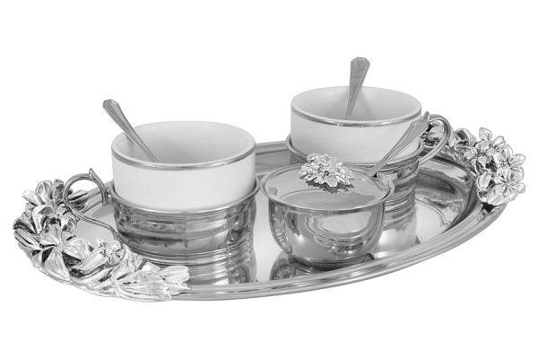 Чайный набор на 2 персоны от бренда Гамма станет отличным подарком для любителей чая. В комплект входит поднос, 2 чашки, 2 ложки и сахарница с ложкой, все с изысканной отделкой под серебро. Этот набор создан для тех, кто ценит красоту и уют в каждой мелочи.