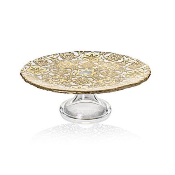 Плоское блюдо с золотым покрытием и рифленым узором «арабески» на прозрачной гладкой ножке. Боросиликатное стекло ручной работы.