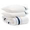 Белый цвет с темно-синим кантом придает этому комплекту стильный и элегантный вид, который подойдет к любому интерьеру спальни. Кроме того, материал легко стирается и сохраняет свою первоначальную форму даже после многих стирок.
