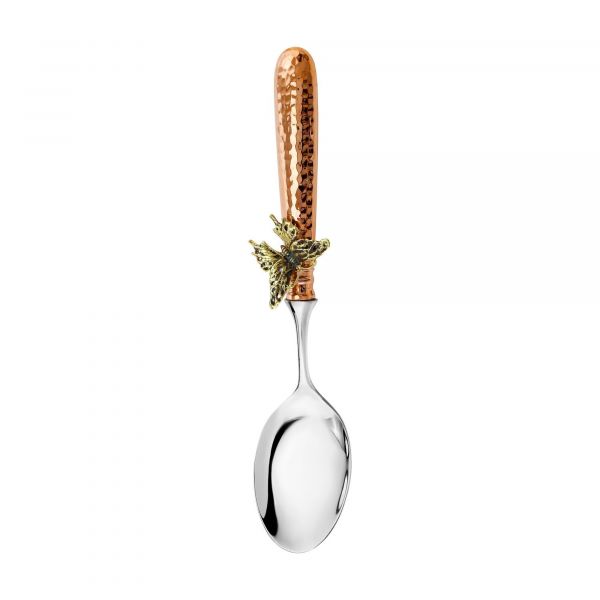 Ложка столовая Бабочка изготовлена из меди с использованием кованых элементов и чернения. Этот изысканный предмет посуды станет не только функциональным элементом вашего сервировочного стола, но и настоящим произведением искусства.