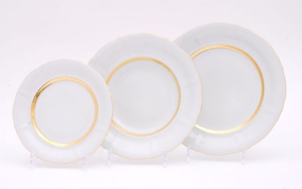 Набор тарелок из 18 предметов 'Золотой кант' форма 'Соната' для сервировки обеденного стола от чешской марки LEANDER. Прекрасный выбор для домашнего уюта и встречи гостей! Создают комфорт и оставляют приятные впечатление.
