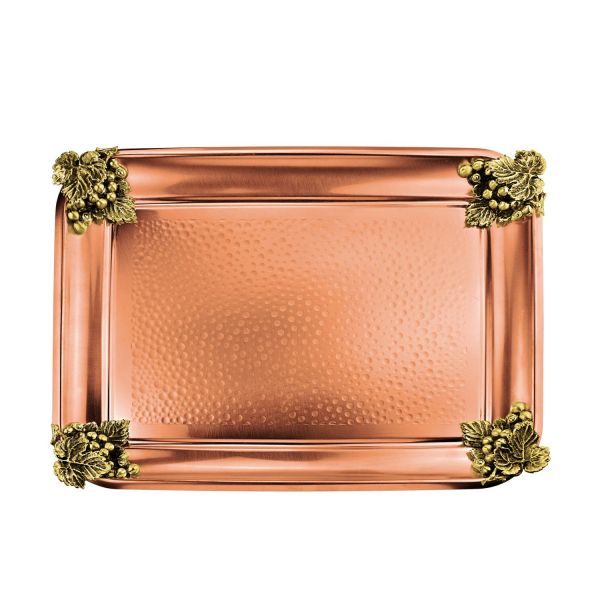 Этот поднос идеально подходит для сервировки как праздничных, так и повседневных блюд. Его прямоугольная форма позволяет удобно разместить на нем различные закуски, десерты или напитки. Благодаря кованому медному исполнению, поднос обладает высокой прочностью и долговечностью, что делает его незаменимым помощником на кухне. Латунные накладки не только украшают изделие, но и защищают его углы от повреждений, продлевая срок службы.