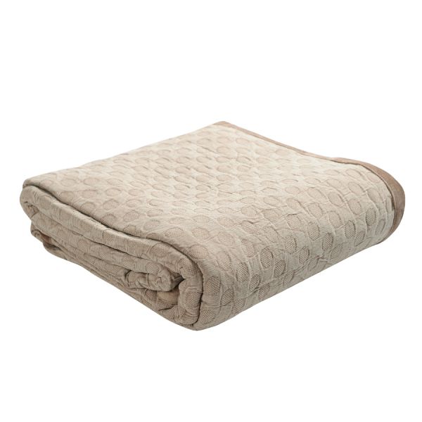 Покрывало базового бежевого оттенка выполнено из прочного стираного хлопка. Материал, обработанный по специальной технологии, более мягкий и нежный. Гипоаллергенное полотно хорошо пропускает воздух, не электризуется, и на нем не образуются катышки.