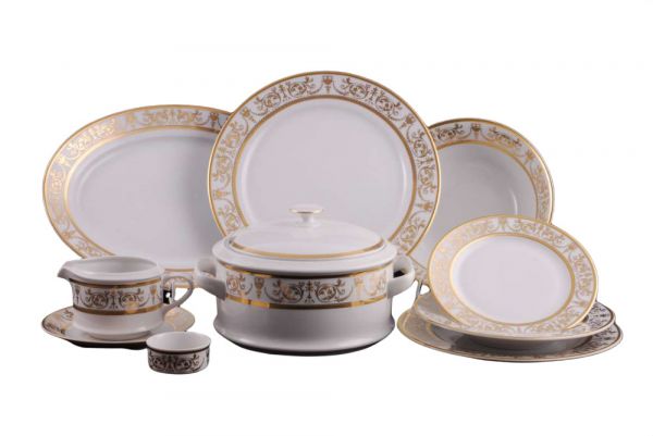 Сервиз включает в себя все необходимые предметы для сервировки стола на шесть персон. Супница, блюда различных форм и размеров, салатники, солонка, соусница, тарелки глубокие, мелкие и десертные - все это позволит вам создать неповторимую атмосферу приема пищи в любое время дня и в любой обстановке.