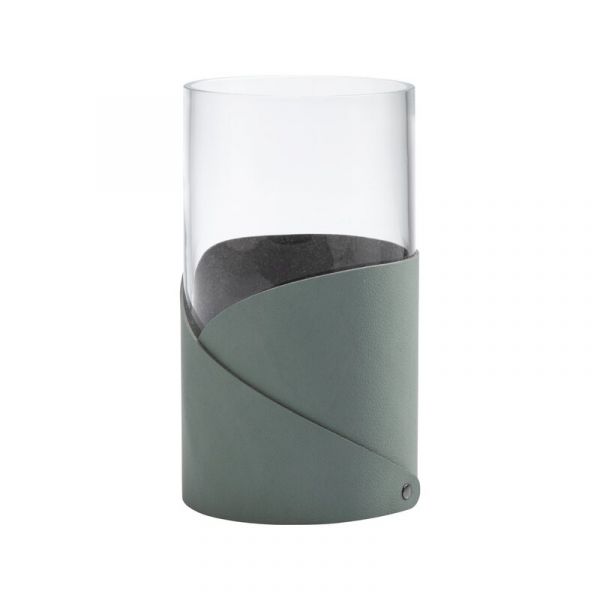 Эта ваза из толстого, ударопрочного стекла обшита чехлом из переработанной кожи с добавлением каучука, что делает ее устойчивой к влаге. Она подходит как для оформления букетов, так и в качестве подставки для различных мелочей, таких как ручки или кухонные принадлежности. Благодаря своему серо-зеленому цвету, ваза станет стильным акцентом в любом интерьере.